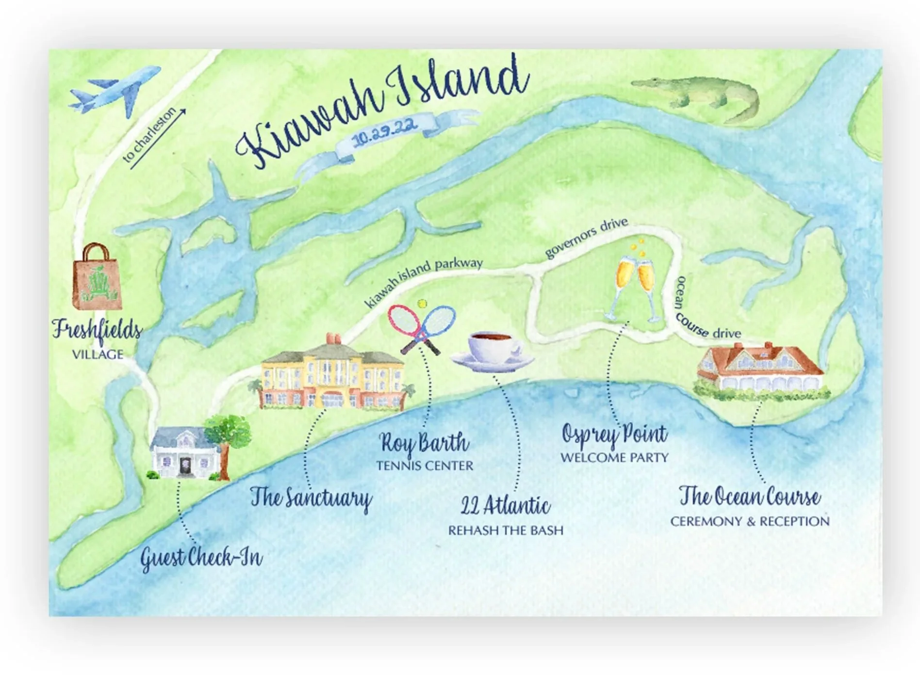 Celebrate your wedding weekend with a hand-painted watercolor map! Each custom map highlights the meaningful places that shape your wedding weekend — from the ceremony and reception to favorite locations, hotels, landmarks, and hidden gems that make your location special.