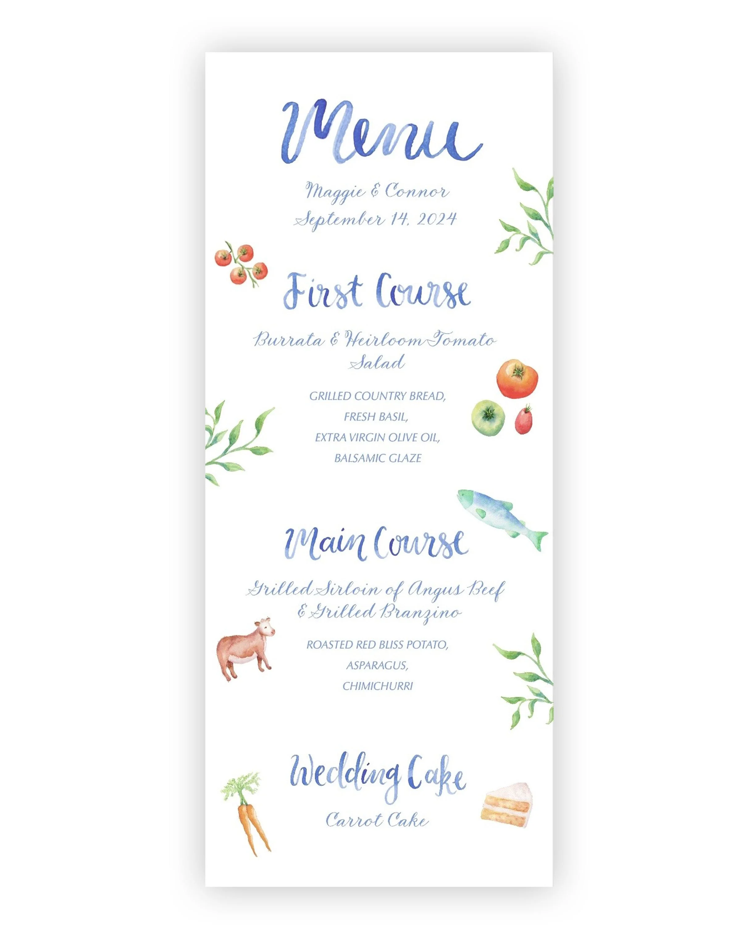 Custom menu designs begin at $150, which includes up to five hand-painted elements (for example: menu headers, florals, or a simple border).
